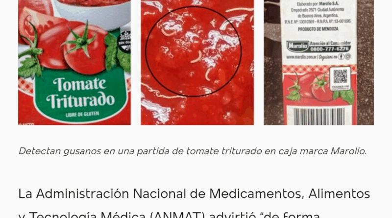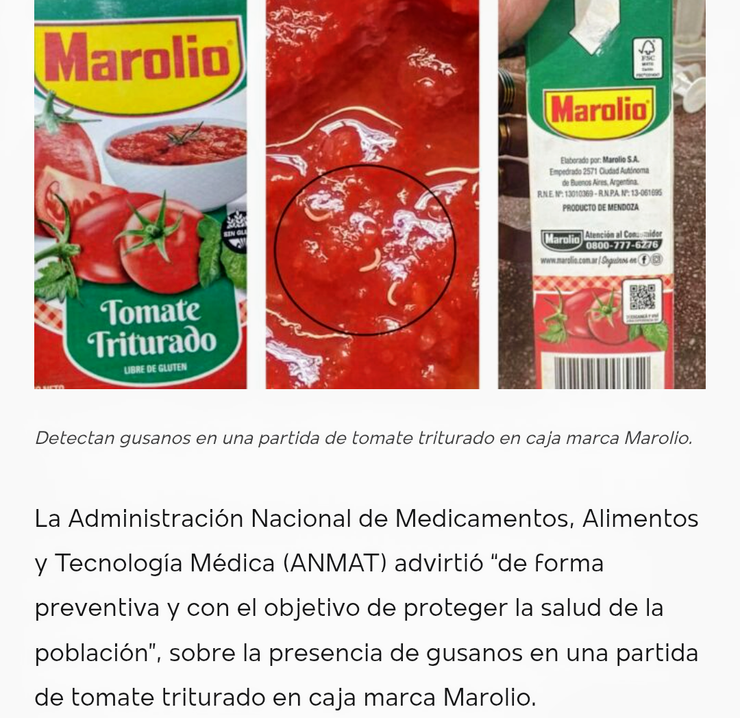 La Administración Nacional de Medicamentos, Alimentos y Tecnología Médica (ANMAT) advirtió “de forma preventiva y con el objetivo de proteger la salud de la población”, sobre la presencia de gusanos en una partida de tomate triturado en caja marca Marolio.