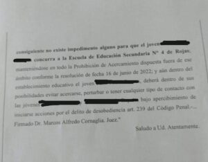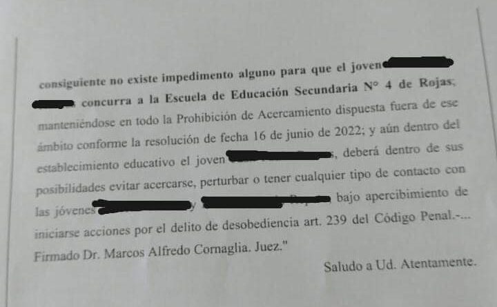 La última resolución indica que dicha “prohibición de acercamiento a un radio de 100 metros no rige dentro del establecimiento educativo ENSNA donde funcionan la EP N° 30 y la EES N° 4 y por consiguiente no existe impedimento alguno para que el joven (denunciado) concurra a la Escuela de Educación Secundaria N° 4”.
