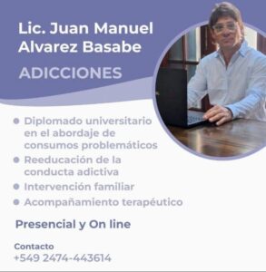 El Licenciado Juan Manuel Álvarez Basabe esta atendiendo problemáticas de adicciones, los días viernes por la tarde en los consultorios ubicados en la calle Mitre 235 de nuestra ciudad –