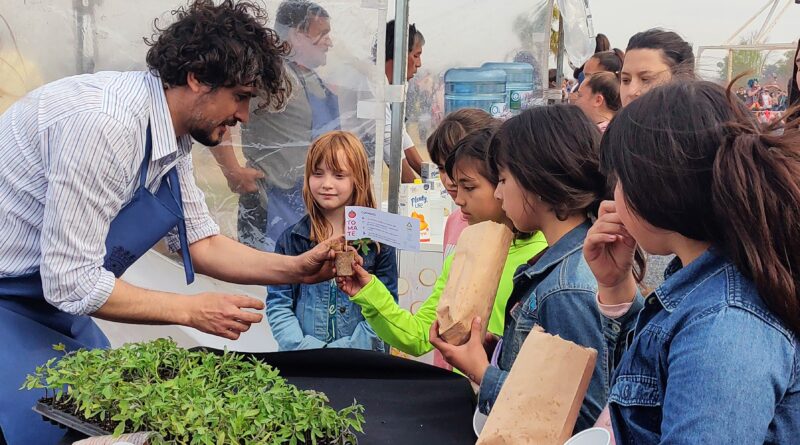 Estaciones saludables con frutas – entrega de plantines de tomates – pochoclos sin azúcar – agua y jugos naturales –