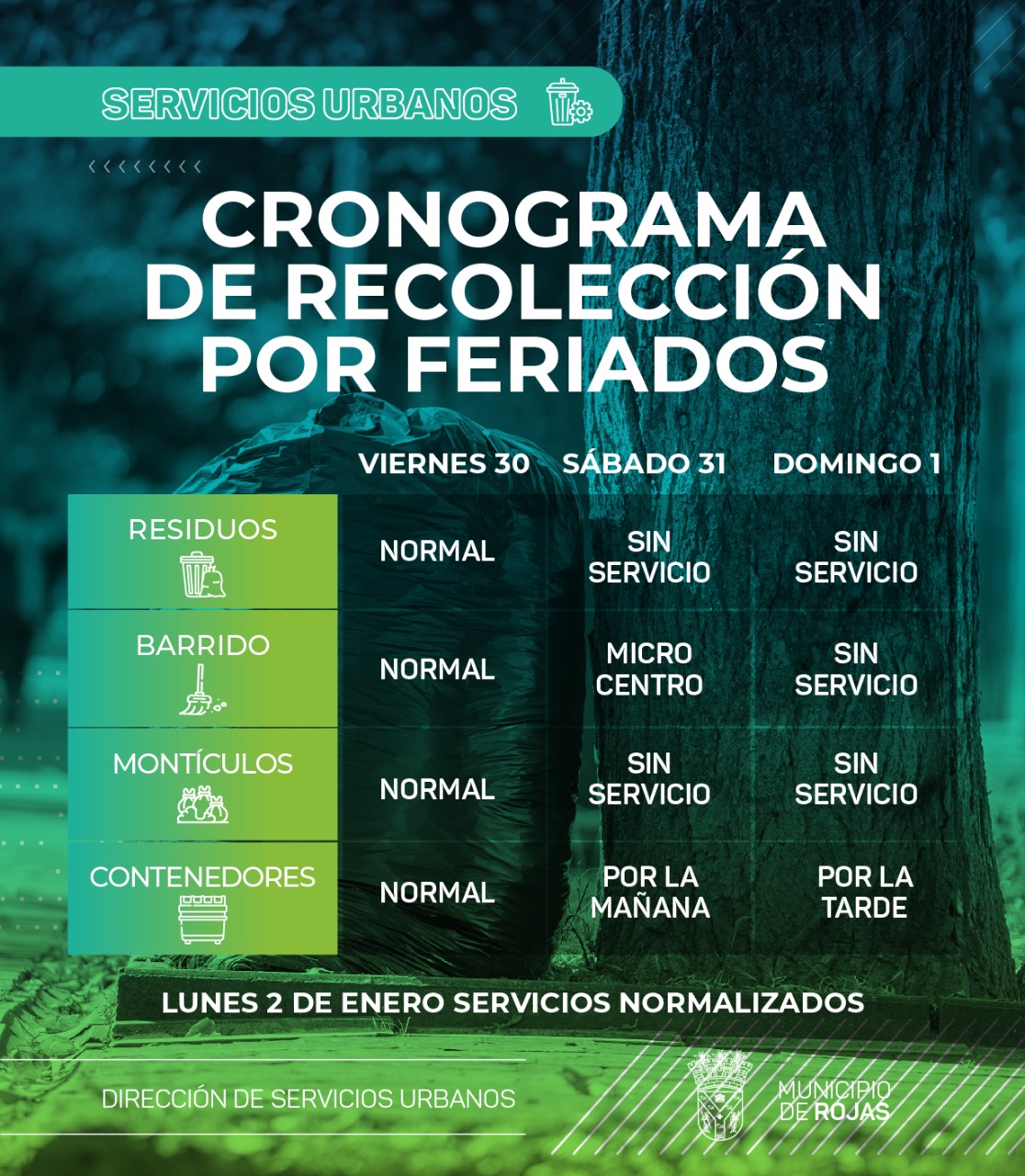 LOCALES El Municipio de Rojas informa el cronograma de recolección de residuos para este próximo fin de semana – 28 de diciembre de 2022 El Municipio de Rojas informa el cronograma de recolección de residuos para este próximo fin de semana –