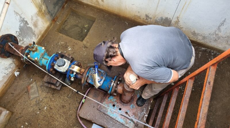 Operarios del área municipal de Obras Sanitarias procedieron a ejecutar el recambio de la válvula de aire que se rompió durante la madrugada del miércoles 26 de febrero.