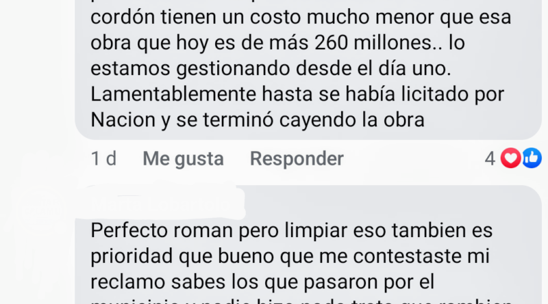 Respecto a lógicos reclamos de los habitantes afectados, en particular por los desbordes en Azara y Pellegrini, el Intendente Román Bouvier procedió a informar a una de las vecinas (respondiendo en las redes sociales), sobre las gestiones que impulsa actualmente ante el Gobierno Provincial tras quedar sin efecto una licitación nacional – (acompañamos captura de pantalla) –