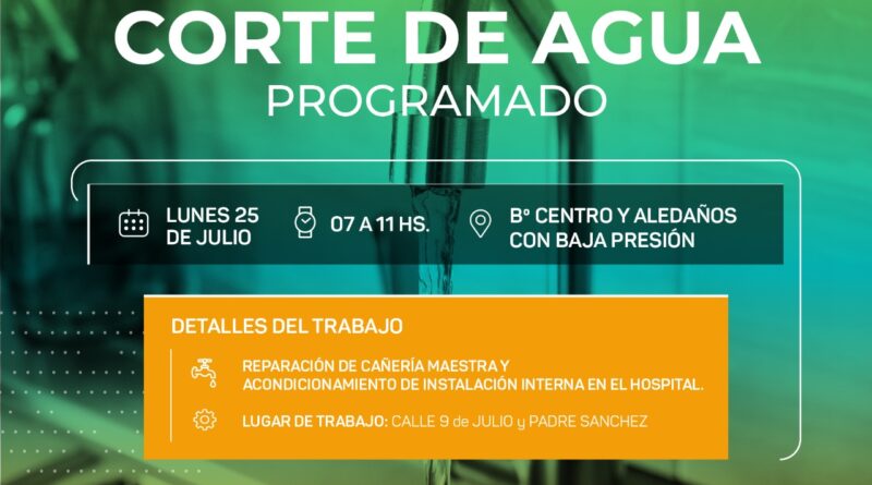 La zona afectada por el corte será en Barrio Centro y aledaños con baja presión.»