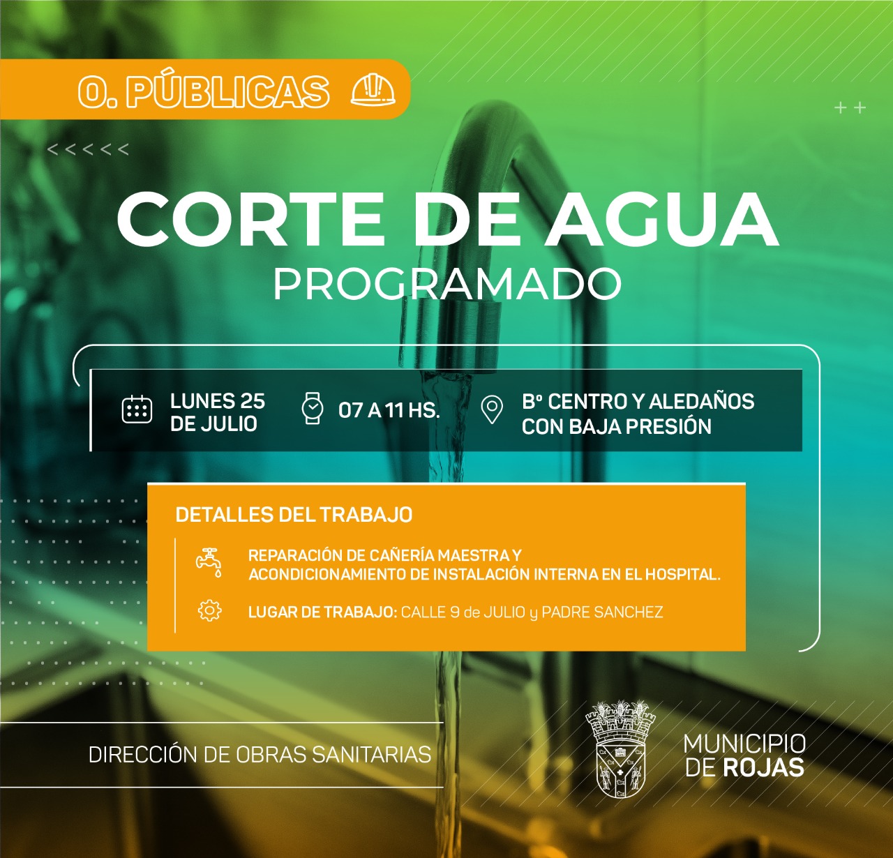 «La Secretaría de Obras y Servicios Públicos y la Dirección de Obras Sanitarias informan que el próximo lunes 25 de julio se producirá una interrupción en el servicio de agua potable en el horario de 7 a 11 horas.