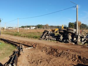En Rojas: Volcó un camión que transportaba hormigón para una obra de cordón cuneta