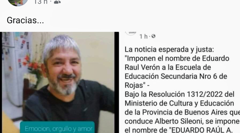 Llegó la ansiada y justa resolución en reconocimiento a la imborrable presencia del querido e inolvidable amigo, Raúl «Poroto» Verón en cada ladrillo, cada pizarra, cada tiza, cada netbook, cada alumna, cada alumno, cada compañera, cada compañero, cada gotita de aire que allí se respira y cada corazón de la comunidad educativa que pasa por esas aulas de la Escuela Secundaria Nro 6 que ahora honrara el nombre de «Eduardo Raúl A. Verón» –