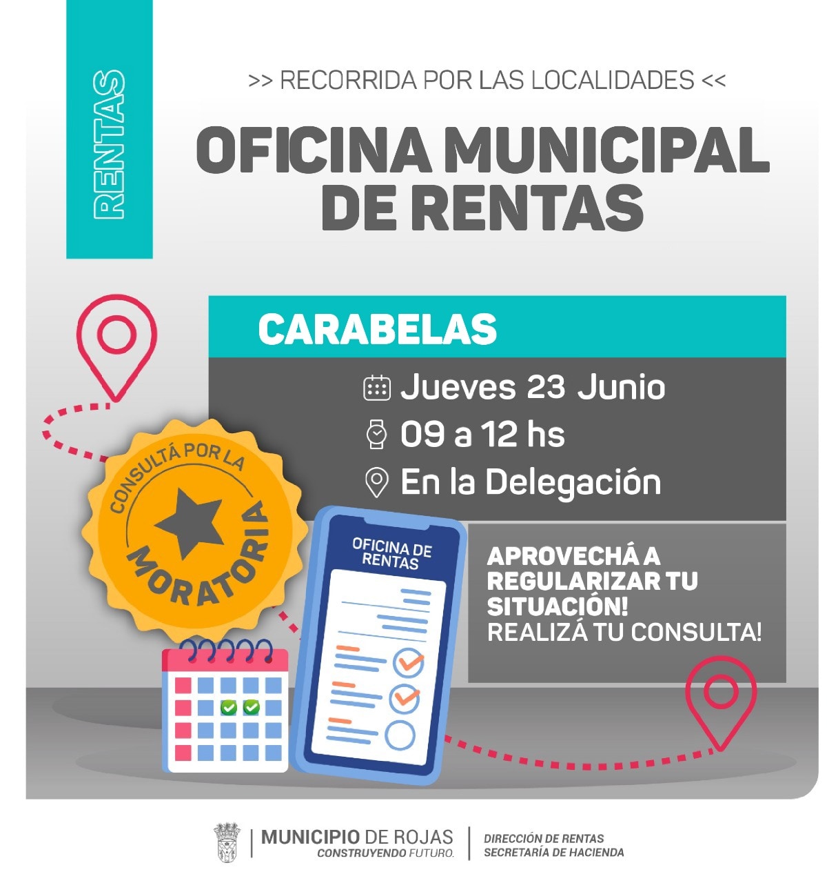 La oficina móvil de rentas del Municipio de Rojas, estará el jueves 23/06 en la localidad de Carabelas –