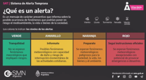 Según anunció el SMN con este alerta amarillo, «el área será afectada por tormentas, algunas localmente fuertes. Las mismas estarán acompañadas por fuerte actividad eléctrica, intensas ráfagas, caída de granizo y abundante caída de agua en cortos periodos».