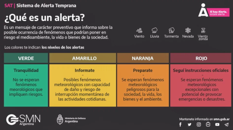 Es un mensaje de carácter preventivo que informa sobre la posible ocurrencia de fenómenos que podrían poner en riesgo el medioambiente, la vida o bienes de la sociedad. Los colores (verde, amarillo, naranja y rojo) indican los niveles de esos alertas.