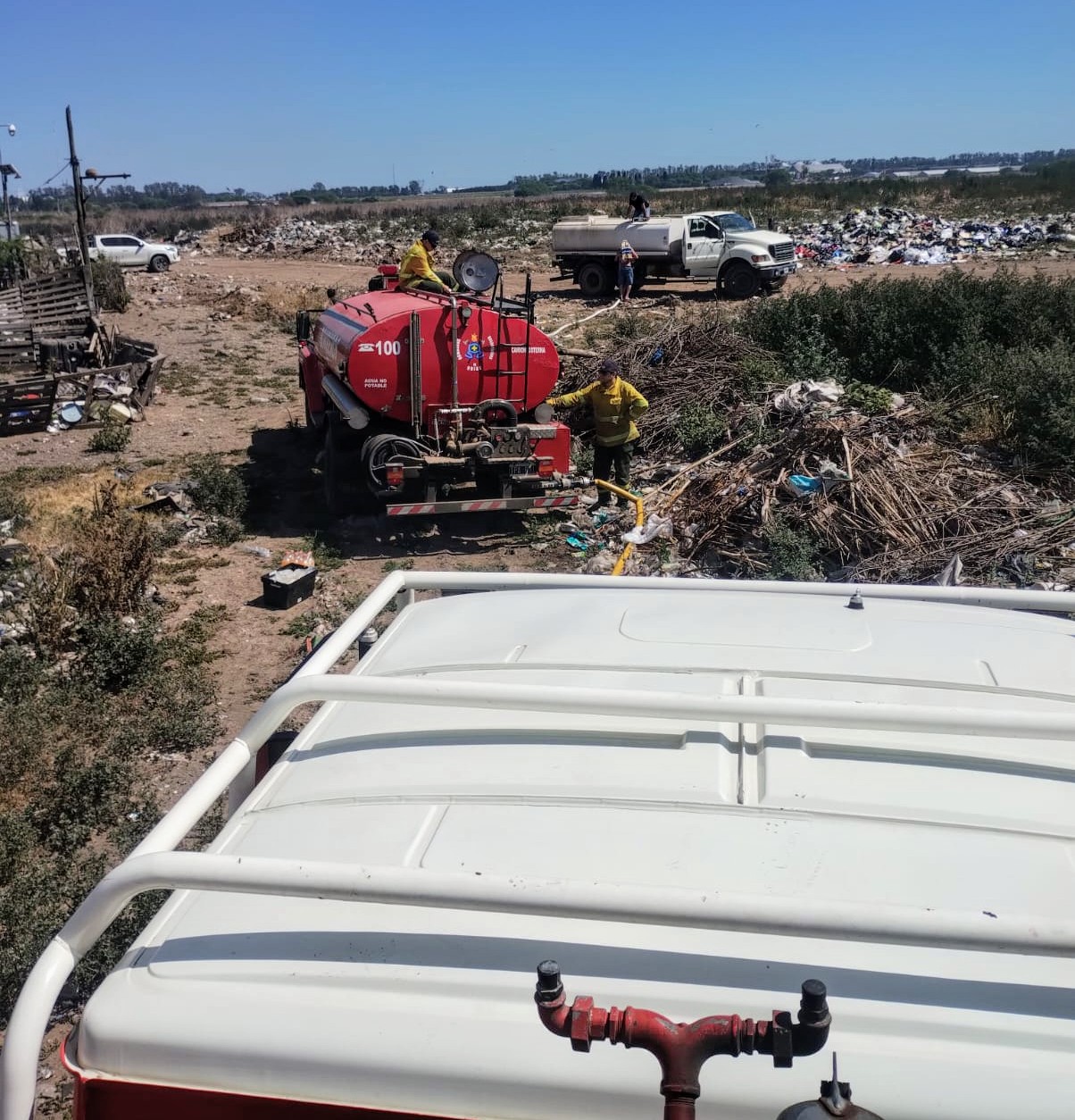 Y, en la mañana de la actual jornada, se contó otra vez con la comprometida intervención de los Bomberos Voluntarios de Rojas junto al fumigador local Fredy Perticarari, sumando la asistencia de un camión regador del Municipio de Rojas –