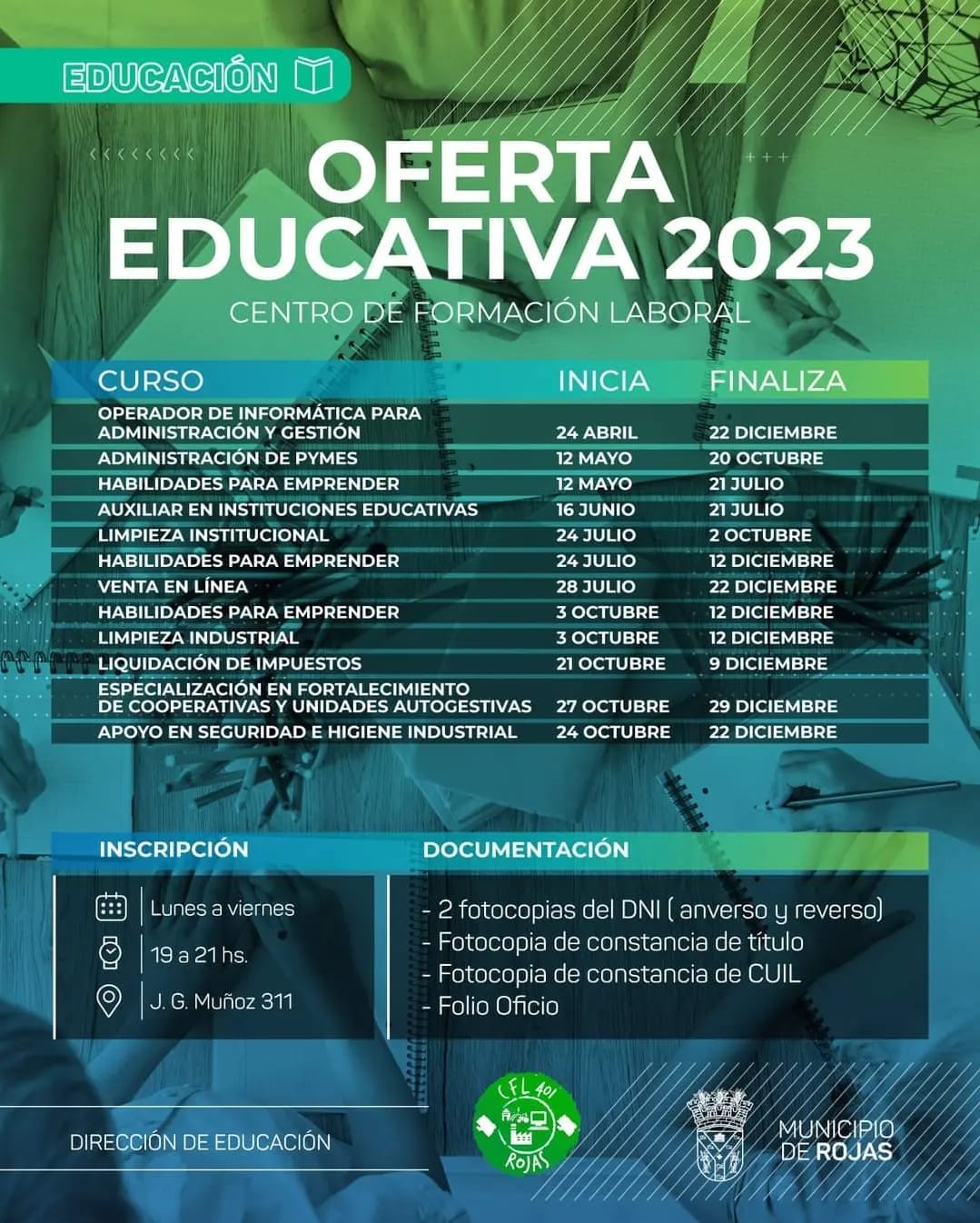 Se encuentra abierta la inscripción a los cursos del Centro de Formación Laboral Nro 401 «Dr. René Pérez» de la ciudad de Rojas –