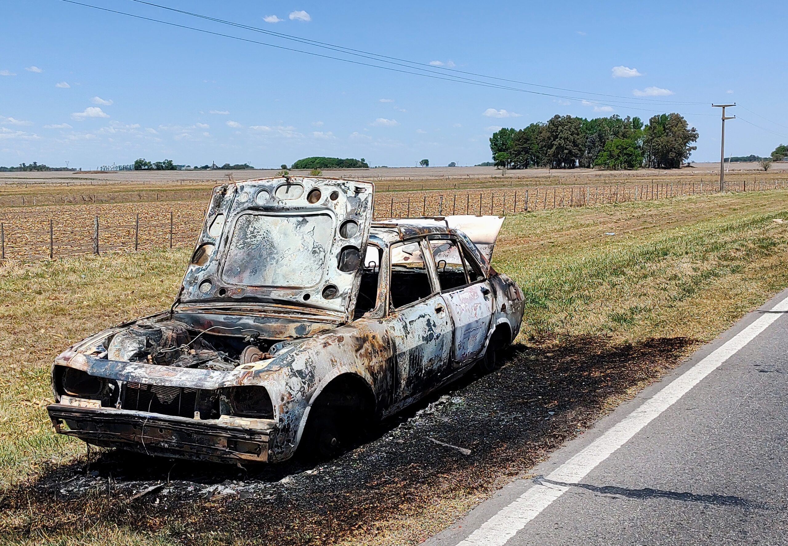 El vehículo, un Peugeot 504, que estaba ubicado en la banquina en sentido Junín/Rojas, resultó totalmente destruído –