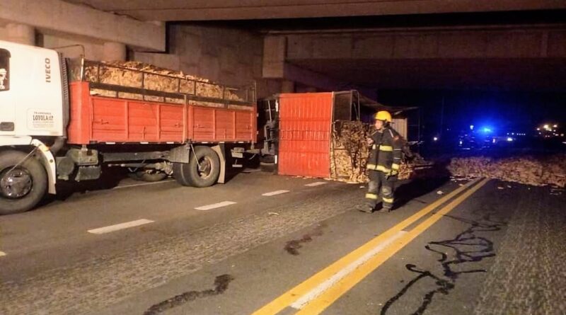 Vuelco de un acoplado en la Ruta 188 bajo el puente de la Autopista 8 –
